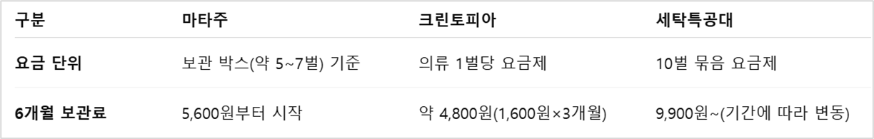 아래 표는 2025년 기준으로 가장 많이 사용되는 3대 옷보관서비스의 기능, 가격, 세탁 연계 여부 등을 한눈에 비교한 것입니다.