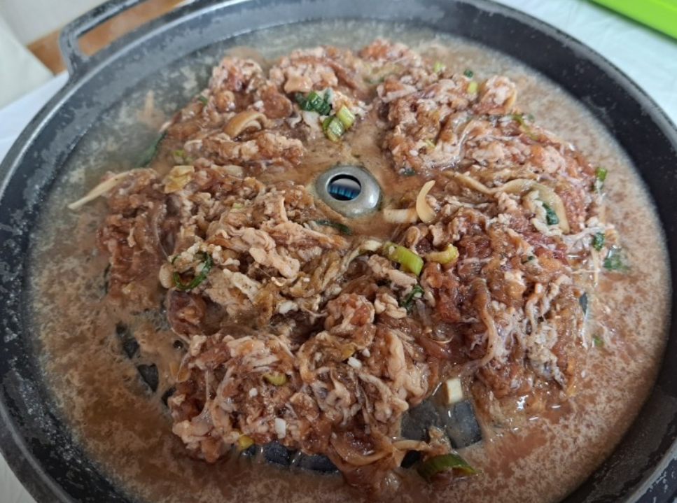 고기를 굽는 동안 떨어지는 육즙이 아래로 흘러 육수에 스며들고, 그 국물은 다시 불고기의 풍미를 끌어올립니다.