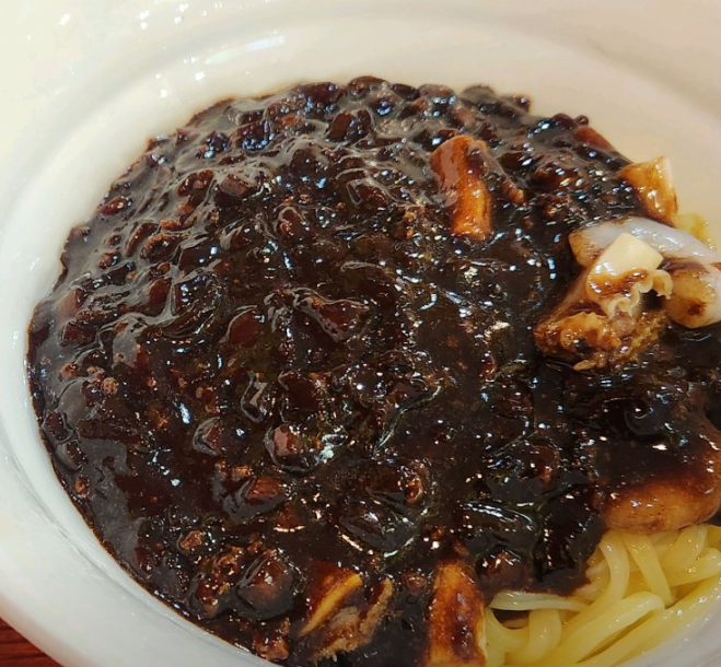 A. 유니짜장이라 갈은 고기가 가득 들어가 있어요. 일반 짜장보다 짭짤하고 담백한 맛!