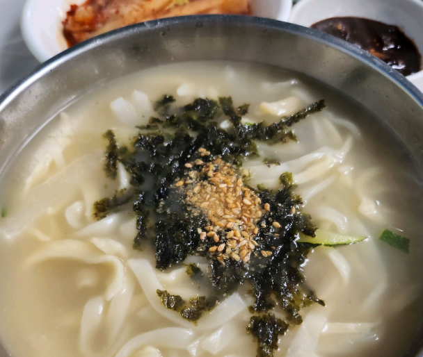 국물은 맑은 편이지만 깊고 진하게 우러난 멸치와 채소육수 베이스.