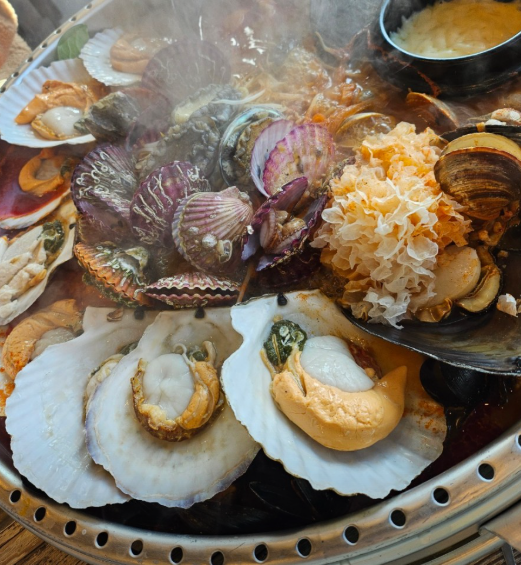 커다란 전골 냄비 안에는 왕조개, 홍합, 백합, 오징어, 새우까지 해산물 풍년!